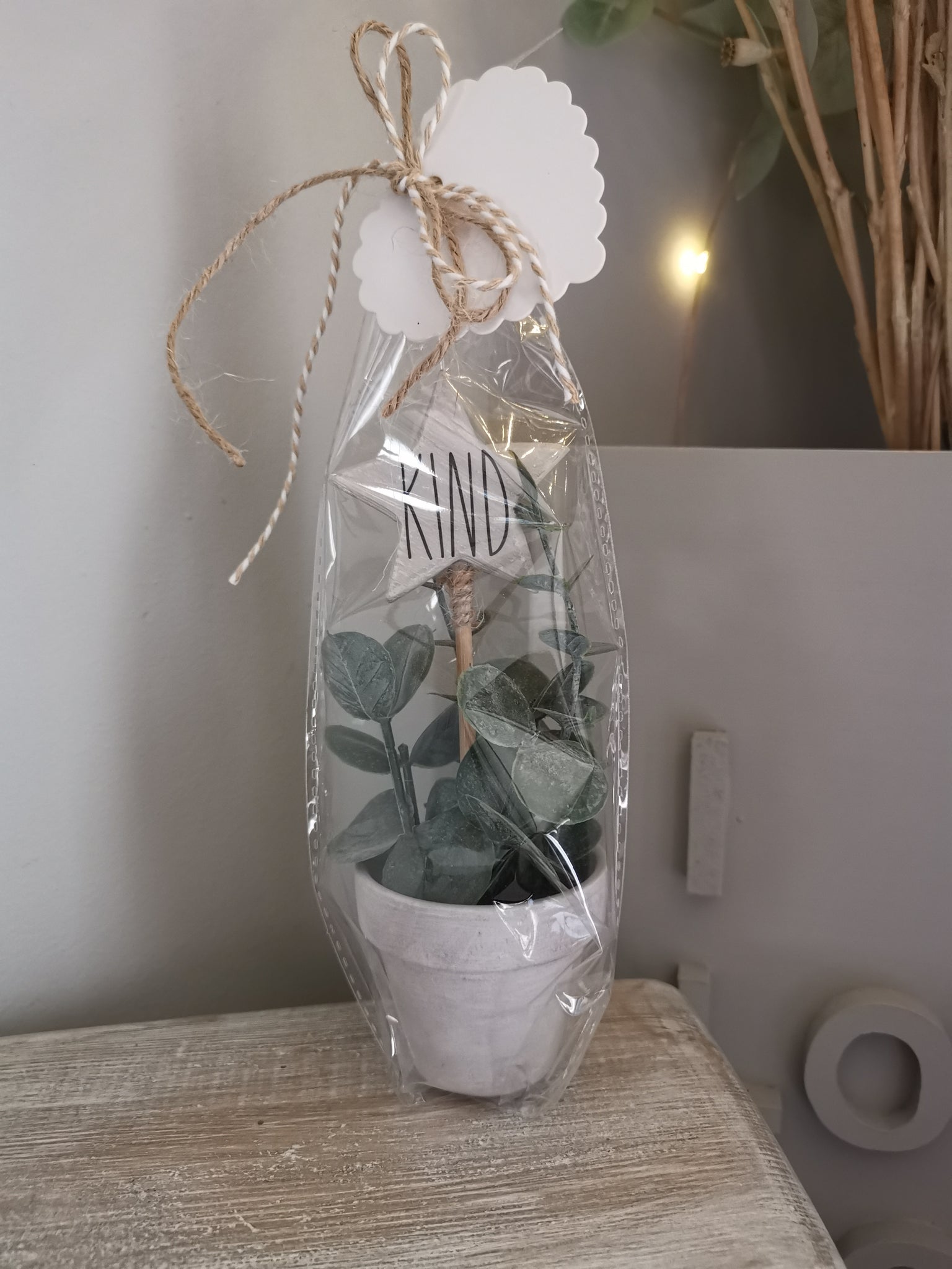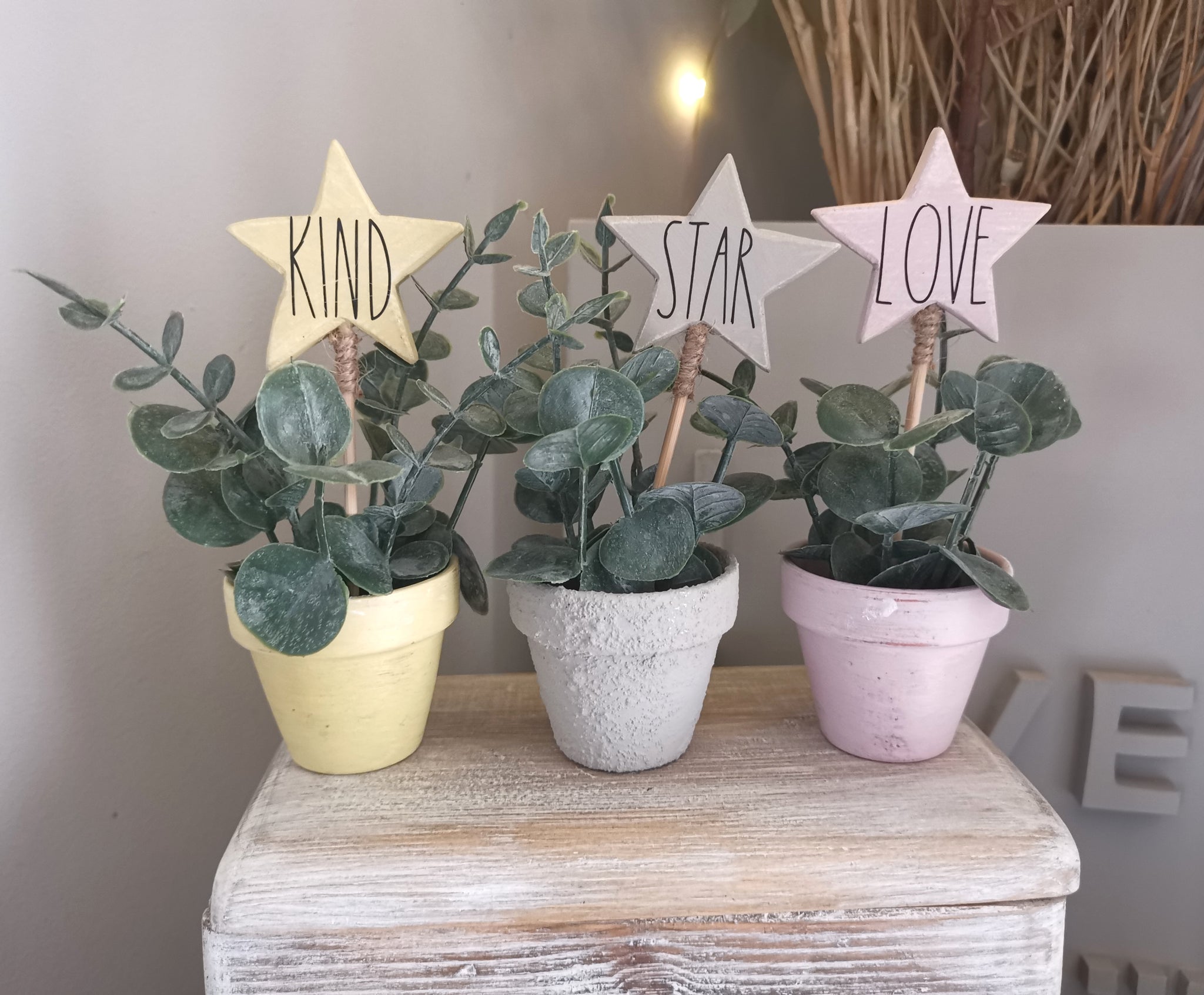 Each pot comes complete with a matching wooden star on stalk with word on. They are wrapped in cellophane with a tag which can have be personalised