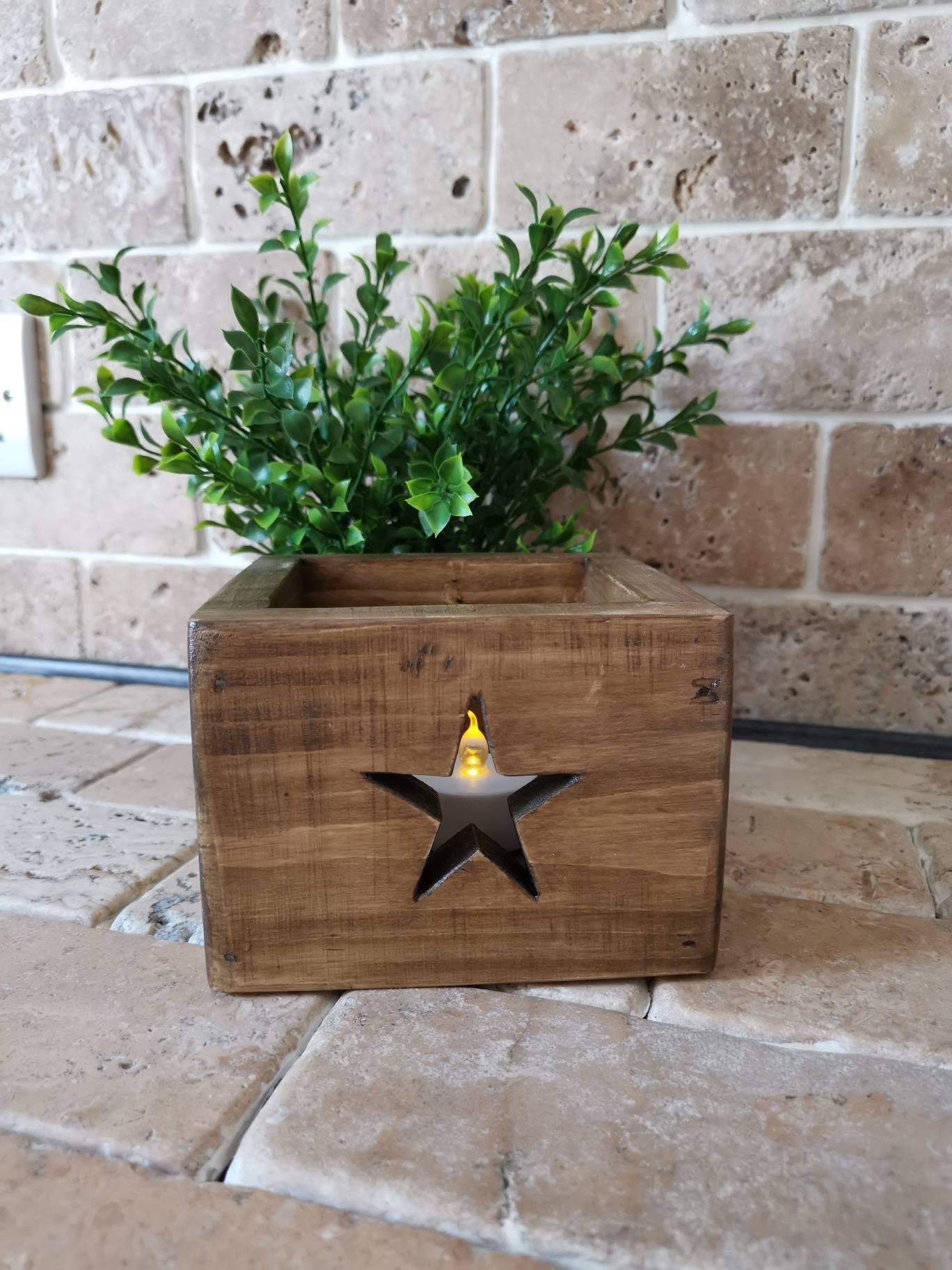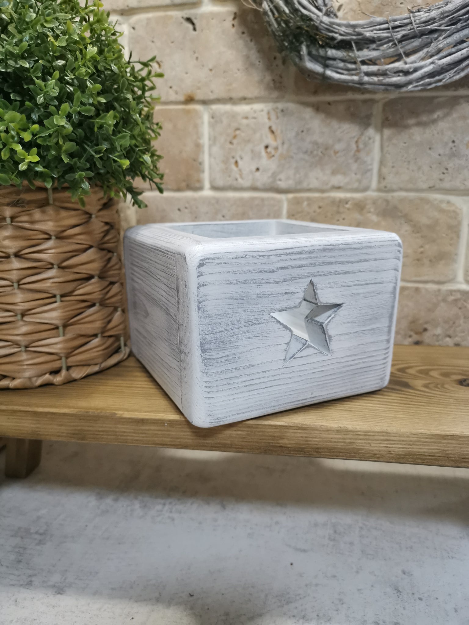 Available in Dark Oak , Rustic white or grey and white finish with either a star or a heart cut out on the front. These would make a lovely table Centerpiece with a battery operated tea light or candle in.